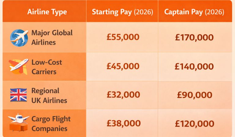 Working as a pilot is a respected and exciting career choice. Many students want to know the average UK pilot salary before starting training. Average UK pilot salaries are different depending on experience and job position. New first officers usually earn around £25,000 to £35,000 per year at the start of their careers. After gaining experience, First Officers can earn between £55,000 and £100,000 or more each year. Senior captains at large airlines often earn over £100,000 to £170,000+ per year. Many experienced UK pilots earn about £47,000 to £61,000 per year on average.