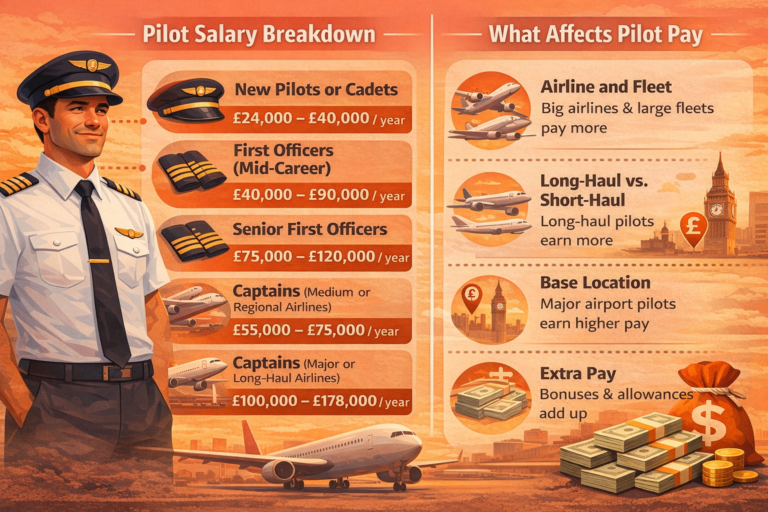 In 2026, pilot salaries in the UK vary a lot. Pay depends on experience, rank, and the airline. First, new pilots usually earn less, while experienced captains at big airlines can earn over £150,000 a year. Next, salaries generally range from £24,000 to over £178,000 per year.