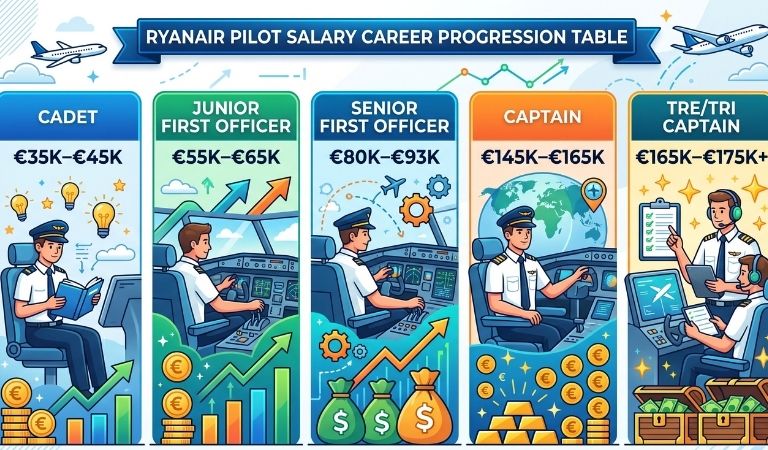 The Ryanair pilot’s salary does not stay the same. It grows step by step as pilots gain experience and move up in rank. Each stage brings higher pay and more responsibility.