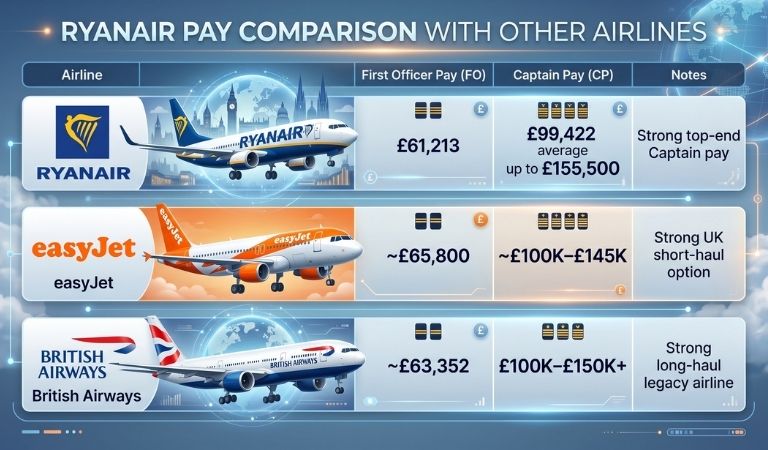 easyJet and British Airways can match or sometimes go slightly higher in certain roles. Even so, Ryanair often stands out because pilots move up faster in their careers.