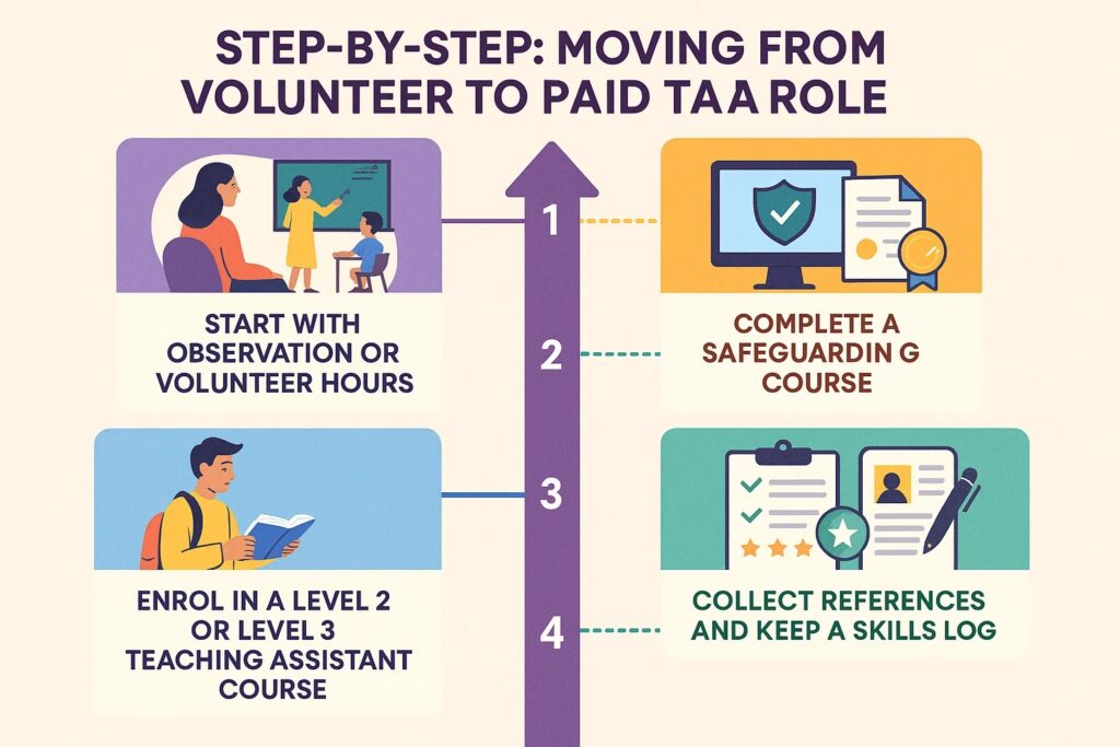 That’s why many people begin their journey this way — volunteering often opens the door to their first paid teaching assistant job.