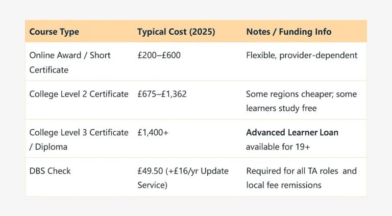 - Online courses cost £200–£600; Level 2 around £700–£1,300; Level 3 from £1,400+. Advanced Learner Loans often cover Level 3.