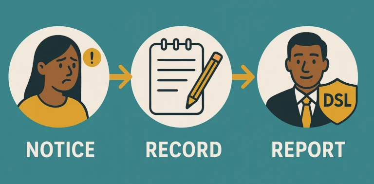 Throughout the day, you’ll jot down quick progress notes — short, factual observations that help the teacher plan next steps. And underpinning everything you do is safeguarding. Following the KCSIE 2025 guidance means you’re alert to signs of concern and always act through the correct route: notice → record → report to the DSL (Designated Safeguarding Lead). It’s part of what makes you a trusted, professional member of the school team.