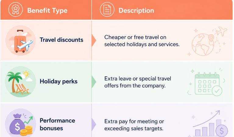 Extra benefits are added to travel agent salaries to boost performance and motivation. They encourage agents to sell more holidays and reach sales targets. They also reward good customer service and successful bookings. On top of that, these benefits make the job more satisfying and help keep employees motivated in a competitive travel industry.