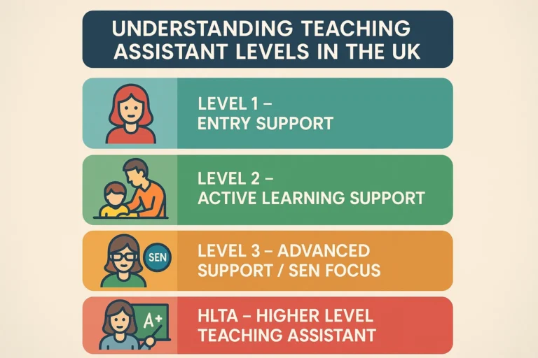 In the UK, teaching assistant roles are organised by levels closely linked to pay and responsibilities. Here’s a simple breakdown: