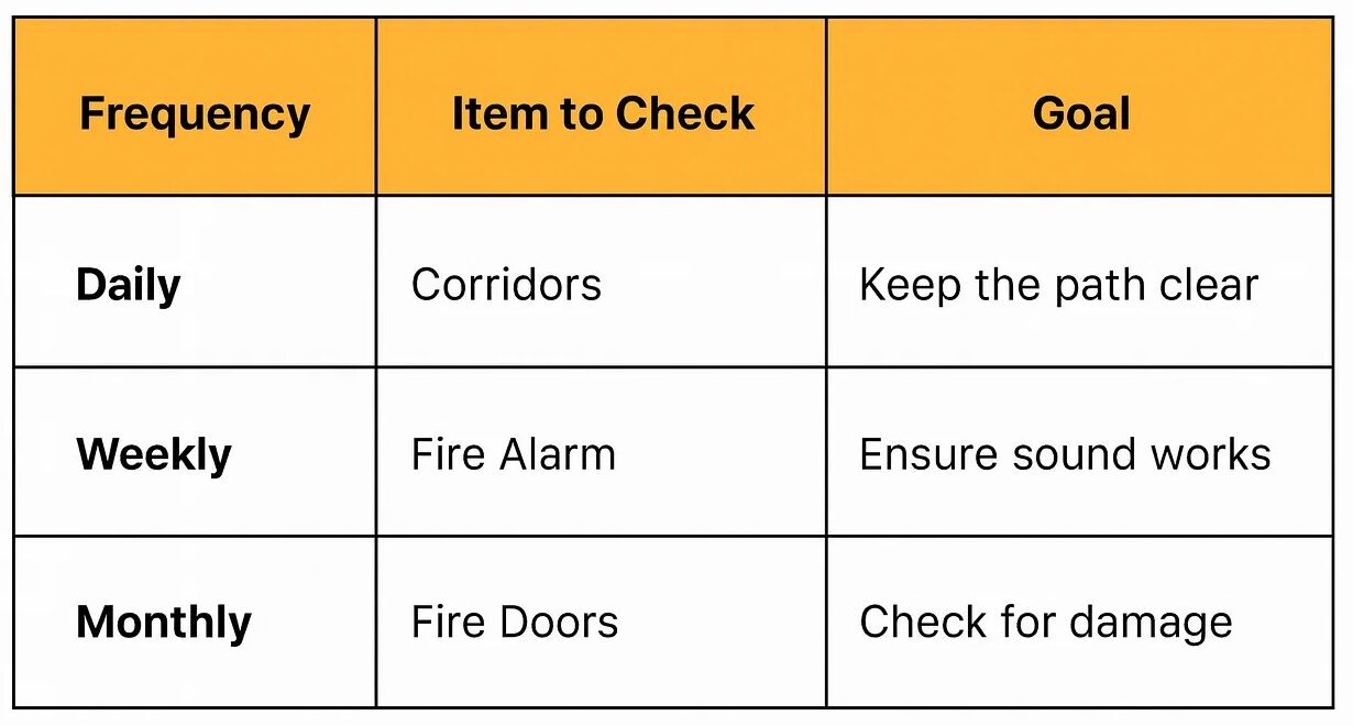 Second, they watch the escape routes carefully. Corridors and stairwells must be clear. If a box blocks a hall, people cannot escape. Furthermore, they check that exit doors open easily.